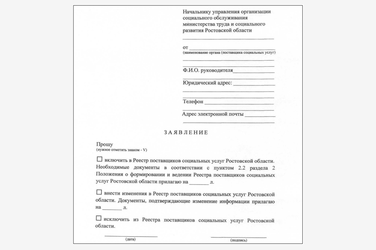 Образец заявления на включение в реестр поставщиков соцуслуг. Источник: Министерство труда и социального развития Ростовской области