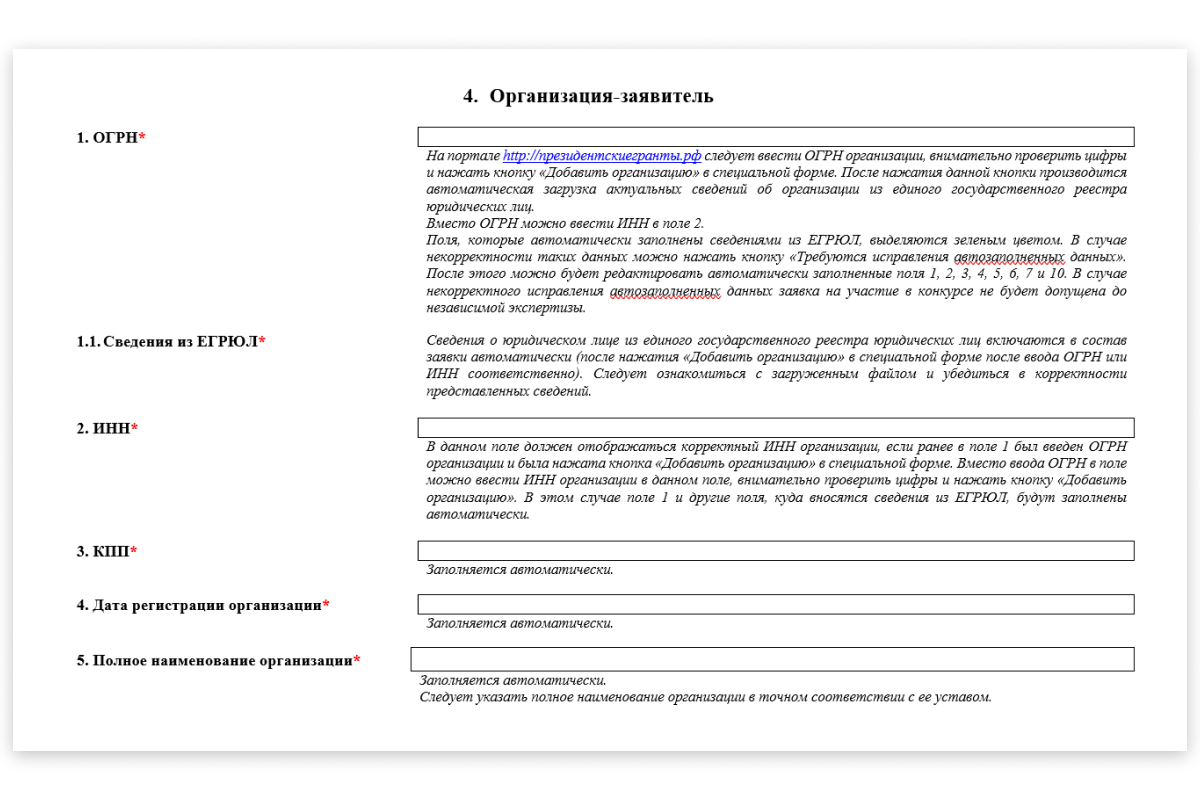 При описании организации обязательно указывают юридические сведения: ОГРН, данные из ЕГРЮЛ, ИНН. Источник: Фонд президентских грантов